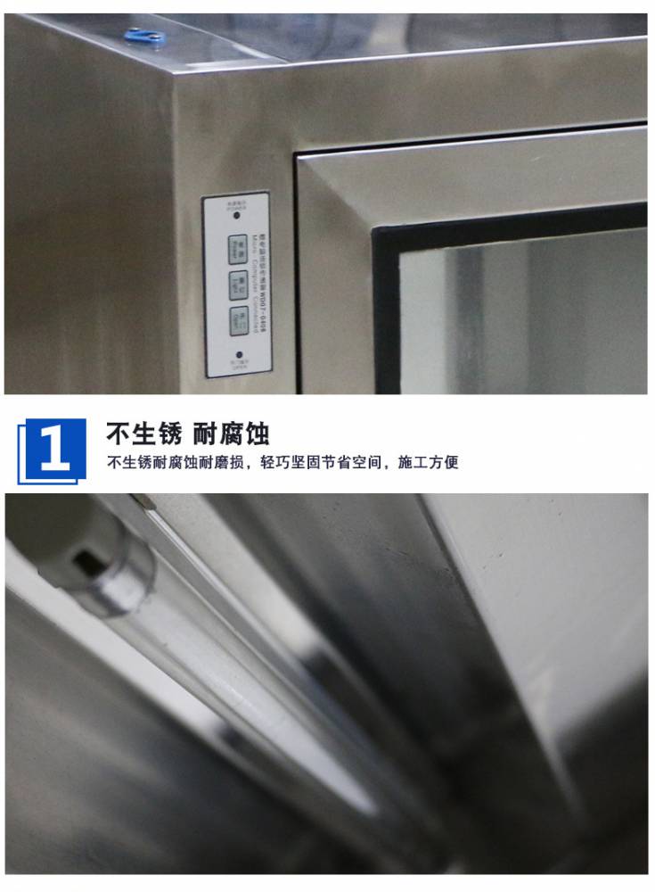 ⒈短距離傳遞窗工作臺(tái)面采用不銹鋼板,平整光潔耐磨